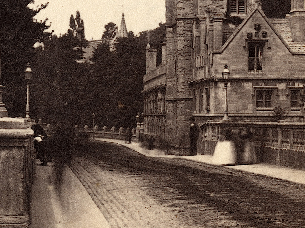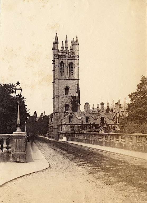 This lovely view of the Magdalen College Bell Tower includes at least nine people strolling across the Magdalen Bridge on Oxford’s High Street or looking down into the river below.