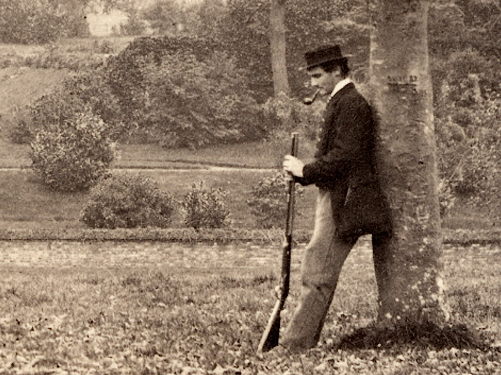 While this artistic composition shows a hunter resting against a tree, the landscape itself is really the subject of the work.