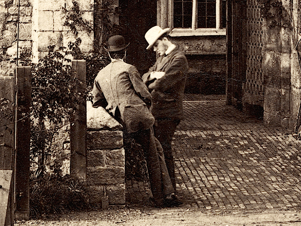 Guidebooks for tourists were commonplace by the mid-19th century. These fellows may be consulting their guidebook for opening times of this venue. Bradshaw's Handbook for Tourists in Great Britain & Ireland of 1858 describes Hever Castle as follows: “Once the residence of the unfortunate Queen Anne Boleyn. . . . many of the rooms present the same appearance as during the visits of Henry VIII. The Castle is still inhabited; it is surrounded by a moat, the entrance embattled and defended by a drawbridge and portcullis. . . . It is open on Wednesdays.”