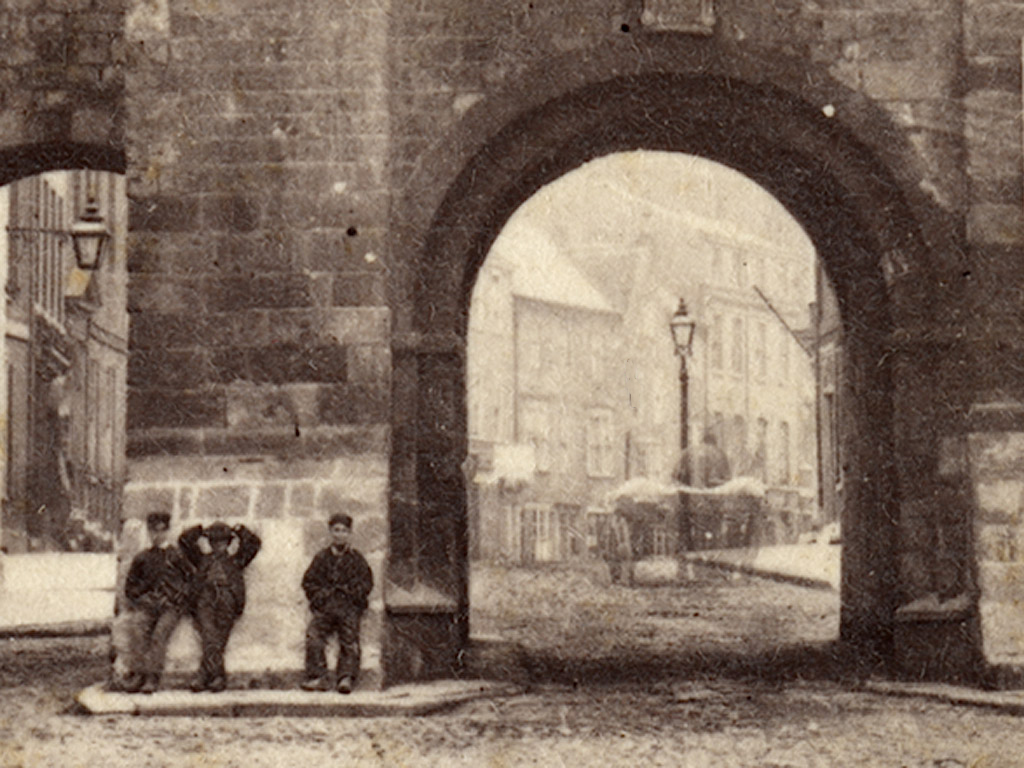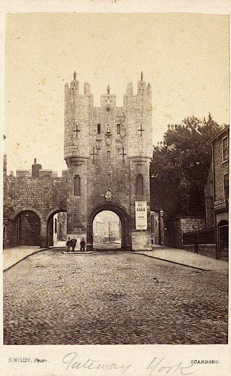 One of the four main gatehouses, or “bars,” along York’s walls, Micklegate (from the Old Norse “mykla gata” or “great street”) was the traditional ceremonial gate for monarchs entering the city. In this photo, local children loiter near the gate at left, and passing beneath the arch appears the ghostly figure of a cart and driver.