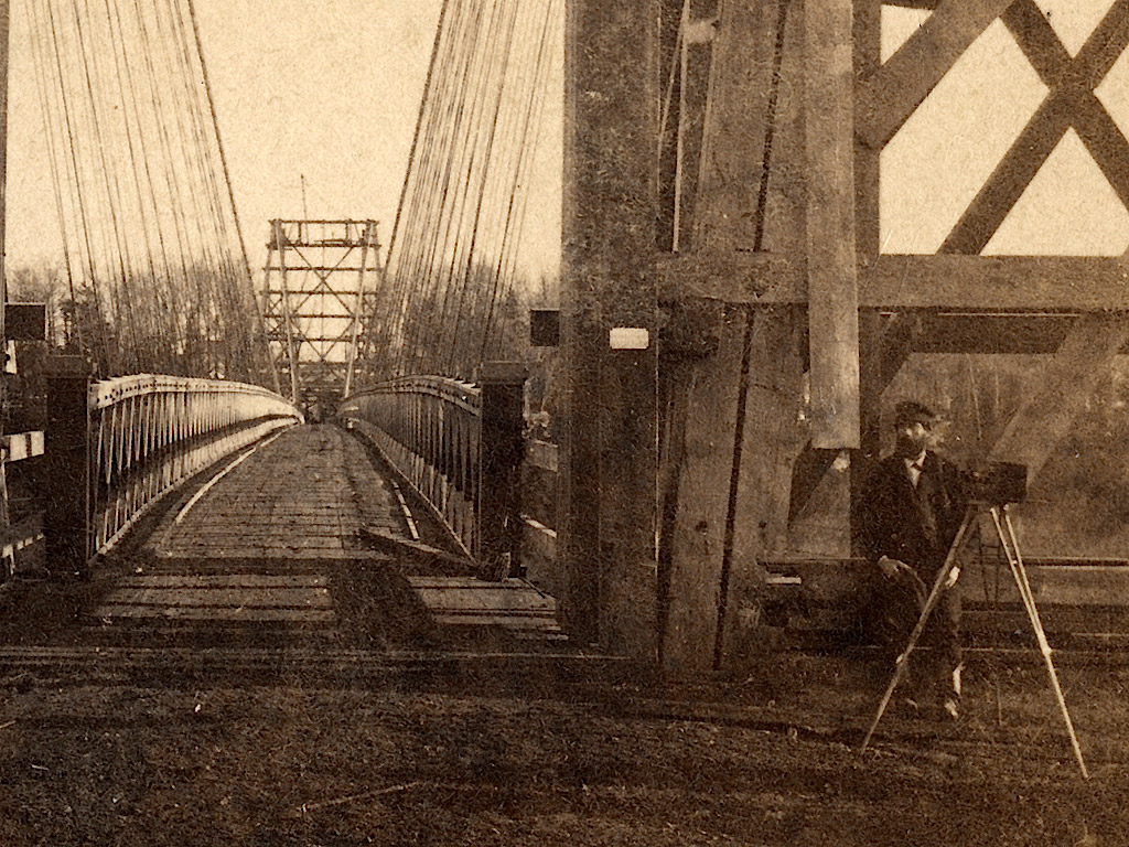 Located north of the American Falls and within sight of Horseshoe Falls, this suspension bridge officially opened on January 2, 1869. Note this portrait of a photographer, posed here with a camera. The card was published by the notorious entrepreneur and sometime photographer Saul Davis.