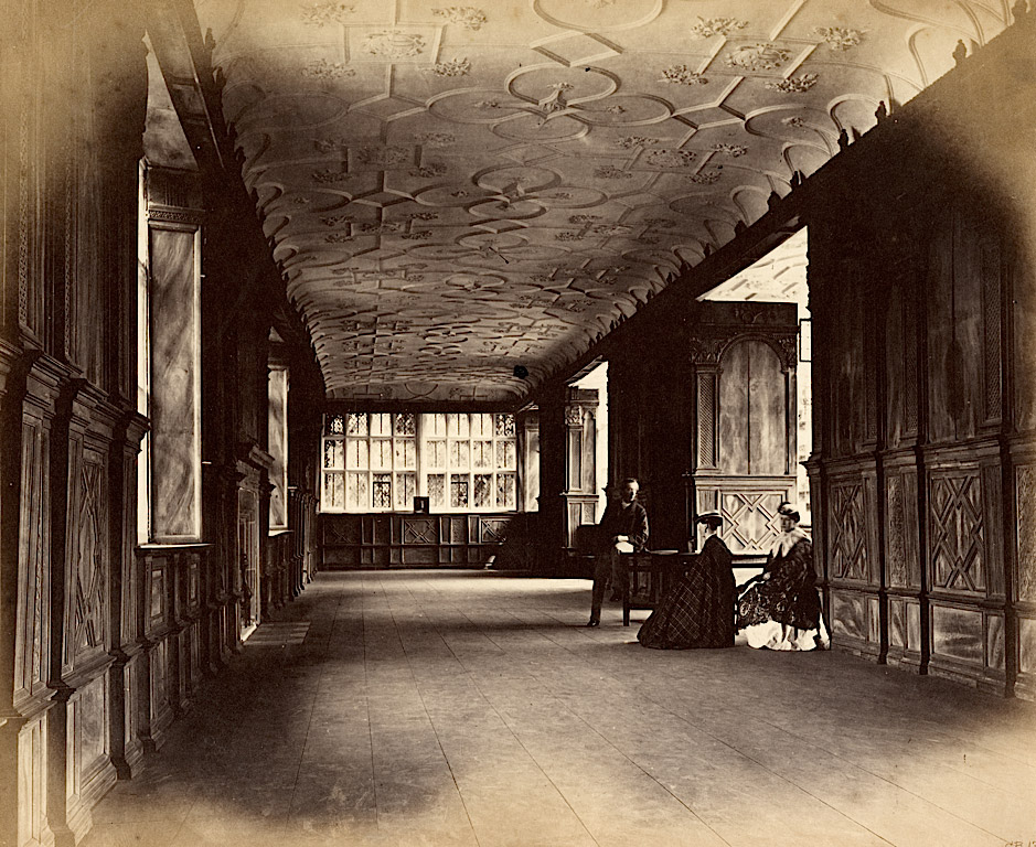 This interior photograph of the Long Gallery at Haddon Hall shows three individuals, perhaps visitors, since they are wearing coats and hats. Interior photography required long exposure times and was tedious for the subjects who had to sit entirely still in order not to appear blurred. Early portrait photographers often used head rests keep the sitters’ heads imobilized. Here, the visitors were fairly successful holding their poses; only their faces are a bit blury.