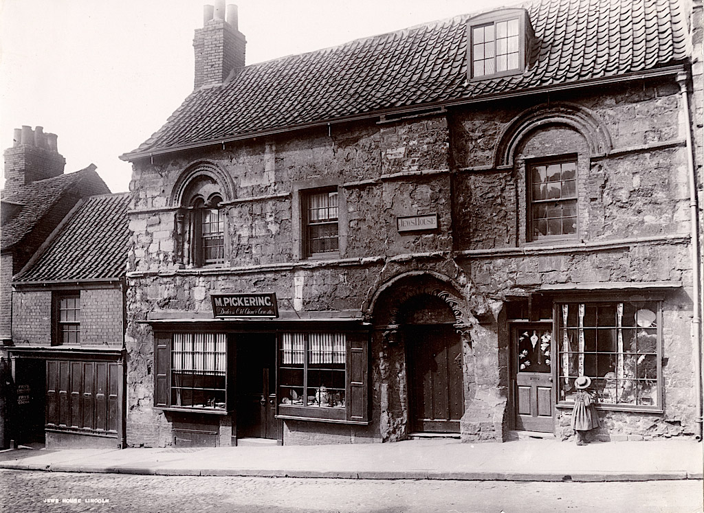 Built c. 1170, this house was part of the 12th-century Jewish community in Lincoln and is one of the earliest and most beautiful medieval stone residences preserved in England today. At the time this photograph was taken, a china and curiosity shop occupied the ground floor.