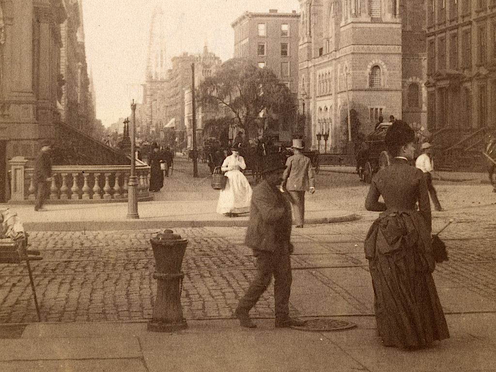 Robert L. Bracklow (1849–1919), from his Glimpses through the Camera series, Fifth Avenue at 42nd Street, New York, USA (detail), September 1, 1888, albumen print cabinet card