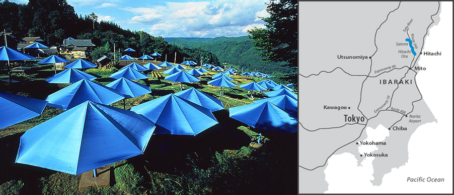 After choosing a lush inland valley seventy-five miles north of Tokyo, Christo and Jeanne-Claude secured permission from 459 property owners (most of them rice farmers) and government agencies in 1987 and 1988. The project was scheduled for early fall, when the landscape would be very green after the summer rains. The 1,340 blue umbrellas, ninety of which stood in the Sato River, were placed at close intervals over twelve miles, reflecting the scarcity of land and the population density.