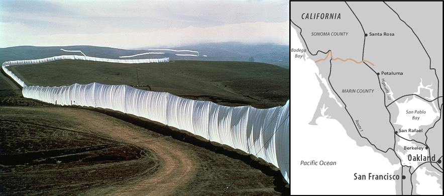 Christo and Jeanne-Claude's Running Fence traversed Sonoma and Marin Counties in northern California from 10 to 23 September 1976. Inspired in part by fencing that demarcated the continental divide in Colorado, the fence was 18 feet high and followed a 24 1/2-mile-long-serpentine path through hilly pasturelands into Bodega Bay.