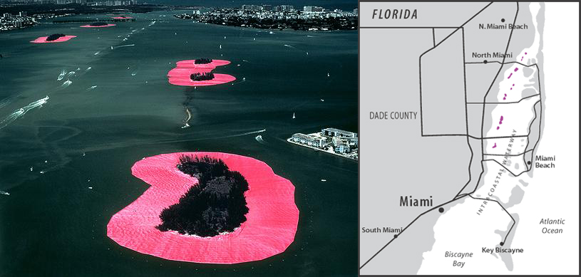 Using 6.5 million square feet of floating pink fabric, Christo and Jeanne-Claude encircled eleven islands in Miami's Biscayne Bay, extending the perimeter of each island by 200 feet. An elaborate undertaking that involved legions of contractors, engineers, attorneys, and seamstresses, Surrounded Islands also required extensive consultation with marine biologists and ornithologists. Ultimately, the project benefited its surroundings: Christo and Jeanne-Claude's crew removed forty tons of garbage from the uninhabited islands.
