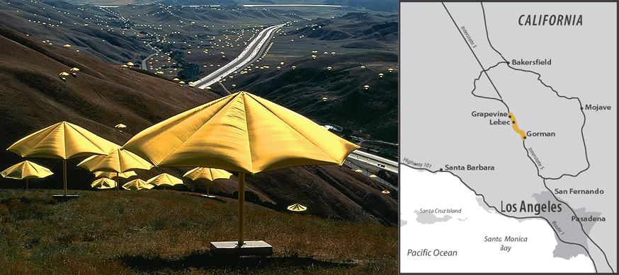 The artists selected an inland valley sixty miles north of Los Angeles and met with the region's twenty-five landowners and government officials in the fall of 1987. To highlight the spaciousness of the uncultivated pastureland, the artists installed 1,760 umbrellas over eighteen miles in a more open manner than in Japan. The vibrant yellow of the umbrellas was chosen to stand out against the brown hills in the dry California fall.