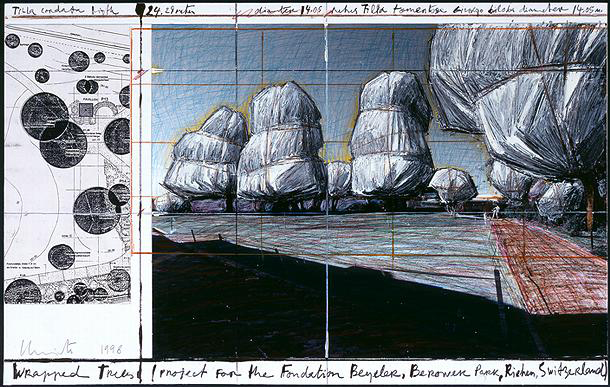 Christo and Jeanne-Claude, Wrapped Trees, Project for the Fondation Beyeler, Berower Park, Riehen, Switzerland, collage 1998, graphite, enamel paint, colored pencil, wax crayon, photograph by Wolfgang Volz, and printed map, on paperboard, 35.5 x 55.7 (14 x 21 15/16). National Gallery of Art, Washington, The Dorothy and Herbert Vogel Collection, Promised Gift of Dorothy and Herbert Vogel, 2001 © Christo 1998