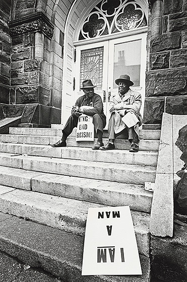 In this photograph, we see two men resting on the steps of a church in Washington, DC. In the foreground, there is an iconic protest sign with the words “I Am a Man.” Another sign, worn by one of the men, says “Honor King: End Racism!”