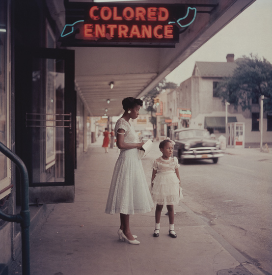 Jim Crow laws—common in many states from the 1890s to the 1960s, especially in the South—mandated the segregation of public spaces, including bathrooms, drinking fountains, restaurants, public transportation, schools, and theaters, such as the one shown here with its neon “colored entrance” sign above Joanne Thornton Wilson and her niece, Shirley Anne Kirksey. Parks’s photo-essay documented the impact of Jim Crow laws on individuals. Rather than focusing on boycotts, demonstrations, or the brutality that marked the fight for justice, Parks captured intimate views of inequality. He also wanted to undo racial stereotypes of African Americans by providing positive accounts of real people.
