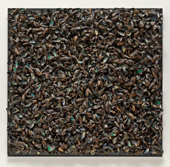 Marcel Broodthaers, Belgian, 1924–1976, Panneau de Moules (Mussel Painting), 1966, mussel shells, resin, and paint on panel, Gift of the Collectors Committee 2005.36.1