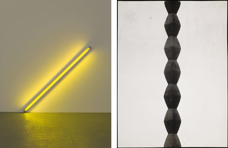 Even as Flavin worked against the grain of art historical tradition, he also embraced it. The parenthetical dedication of the diagonal to Constantin Brancusi indicates his sentimental attachment to the modern Romanian sculptor. Indeed, Flavin not only dedicated the work to Brancusi, but directly compared his lone tube to Brancusi’s famous "endless column," in which he stacked repeating wedge-shaped metal forms. As Flavin explained, "Both structures had a uniform elementary visual nature, but they were intended to exceed their obvious visible limitations of length and their apparent lack of complication."