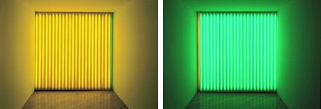 Flavin more thoroughly integrated his fluorescent light constructions with the surrounding architecture in his so-called "corridor" pieces, in which a series of parallel fluorescent tubes extend across the width of a hallway, thereby blocking access and forcing visitors to find an alternative pathway. In untitled (to Jan and Ron Greenberg), a corridor is obstructed by bars of light—green on one side, yellow on the other. A small open space between the last fluorescent tube and the wall permits a glimpse of the reverse color so that the primary color is tinged by the effects of the light spilling in from the back.