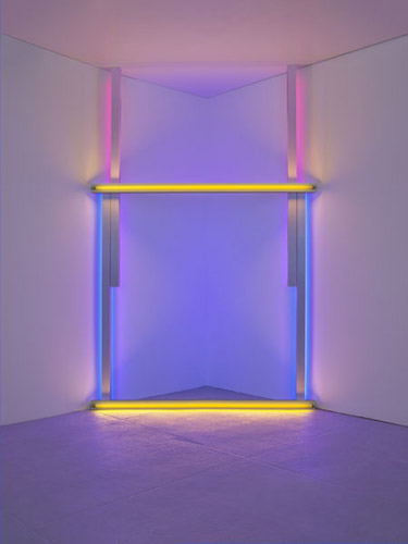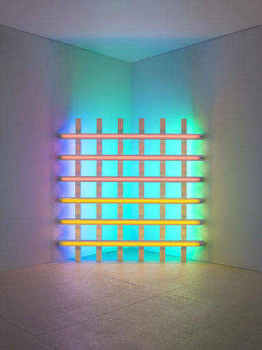 (left) Dan Flavin, untitled (to Henri Matisse), 1964, pink, yellow, blue, and green fluorescent light, 8 ft. (244 cm) high, Private collection, New York, Photo: Billy Jim, New York © Stephen Flavin/Artists Rights Society (ARS), New York