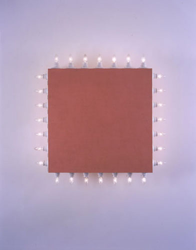 Dan Flavin, icon V (Coran's Broadway Flesh), 1962, oil on cold gesso on Masonite, porcelain receptacles, pull chains, and clear incandescent "candle" bulbs, 41 5/8 x 41 5/8 x 9 7/8 in. (105.9 x 105.9 x 25.1 cm), Private collection, New York Photo: Bill Jacobson, New York © Stephen Flavin/Artists Rights Society (ARS), New York