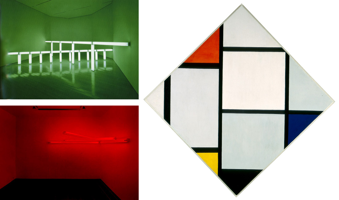 (top left) Dan Flavin, greens crossing greens (to Piet Mondrian who lacked green), 1966, green fluorescent light, first section: 4 ft. (122 cm) high, 20 ft. (610 cm) wide, second section: 2 ft. (61 cm) high, 22 ft. (670 cm) wide, Solomon R. Guggenheim Museum, New York, Panza Collection, 1991 © Solomon R.Guggenheim Museum, New York © Stephen Flavin/Artists Rights Society (ARS), New York