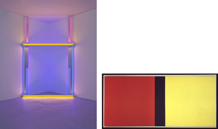 (left) Dan Flavin, untitled (to Barnett Newman to commemorate his simple problem, red, yellow, and blue), 1970, yellow, blue, and red fluorescent light height variable, 8 ft. (244 cm) wide across a corner, National Gallery of Art, Washington, Gift of the Barnett & Annalee Newman Foundation, in honor of Annalee G. Newman, and the Nancy Lee and Perry Bass Fund, Photo: Billy Jim, New York © Stephen Flavin/Artists Rights Society (ARS), New York. 2004.40.1