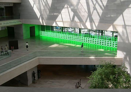 The construction untitled (to you, Heiner, with admiration and affection) embodies what fellow minimalist Donald Judd described as Flavin’s "interior articulation" of a space. Extending some 120 feet, the installation of this "green barrier" at the National Gallery of Art fills and redefines the space of the mezzanine terrace by imbuing the mezzanine with a glowing green hue, impeding visitors’ movement as they are forced to navigate around the monumental work and heightening their perception of the architecture.