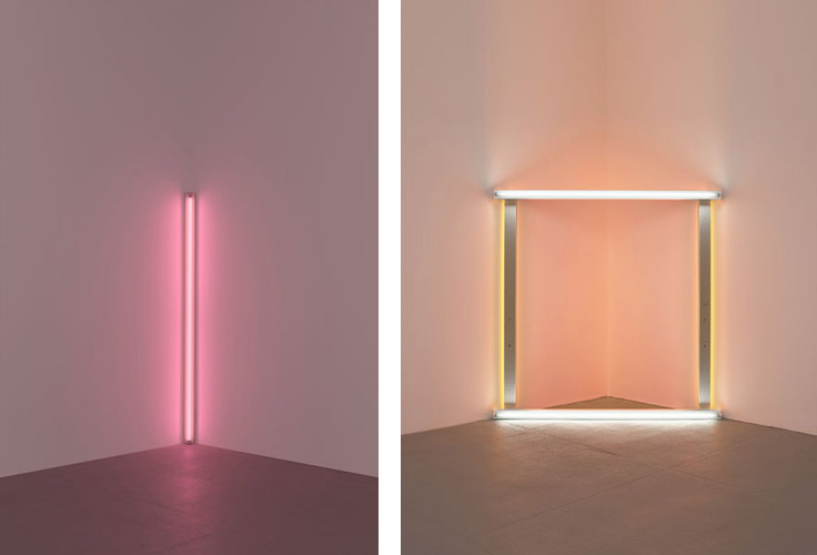(left) Dan Flavin, pink out of corner (to Jasper Johns), 1963, pink fluorescent light, 8 ft. (244 cm) high, Collection Stephen Flavin, Photo: Billy Jim, New York © Stephen Flavin/Artists Rights Society (ARS), New York