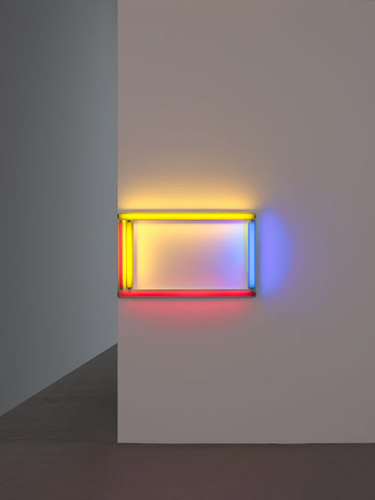 Although Flavin’s earliest fluorescent works were installed on the walls like paintings, early on he began to explore the full space of the room, exploiting the overlooked margins. In 1964, at Flavin’s first solo exhibition at the Green Gallery in New York, for instance, the artist hung a primary picture at the edge of the gallery wall, adjacent to a doorway. In occupying the edge, where wall meets empty space, Flavin abandoned the conventional space of art and allowed the art object to address the interior in a new way. With an ironic twist, Flavin constructed the fluorescent lights as a rectangle surrounding a void, mimicking the shape of a picture frame and mocking the rigid traditions of art.