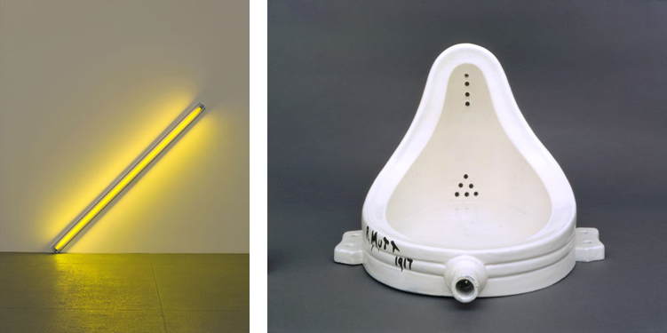 By declaring that a fluorescent light tube could stand on its own as a work of art, Flavin boldly yet simply challenged the history of art, in particular the discipline’s theoretical separation of art and everyday life. The critique follows in the philosophical footsteps of Marcel Duchamp, whose "readymades" of the early twentieth century consisted of ordinary, utilitarian objects (such as a bicycle wheel, bottle drying rack, or urinal) that Duchamp isolated from their functional context and placed within the environment of a work of art. In so doing, Duchamp deemed an object to be art by virtue of selection alone.