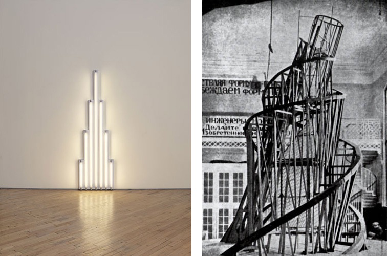 Flavin directly approached the genre of the monument in his large series, "monuments" for V. Tatlin, named for the artist Vladimir Tatlin (1885-1953). Tatlin was influential in post-1917 Russia, where he sought to use his art to uphold the utopian ideals of the revolution. Flavin was especially struck by Tatlin’s famous Monument to the Third International (1919-1920)—a project for a colossal, tilted iron tower surrounded by two spirals, containing rotating geometric glass halls. Never built, Tatlin’s monument became a symbol for ambitious yet unrealized utopian dreams.