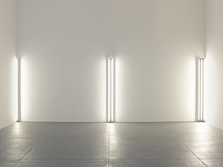 (left) Dan Flavin, "monument" 1 for V. Tatlin, 1964, cool white fluorescent light, 8 ft. (244 cm) high, Dia Art Foundation, Photo: Billy Jim, New York © Stephen Flavin/Artists Rights Society (ARS), New York