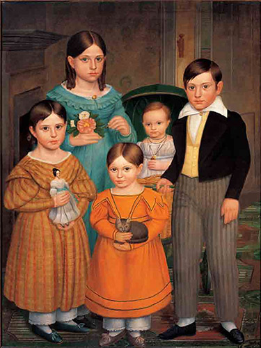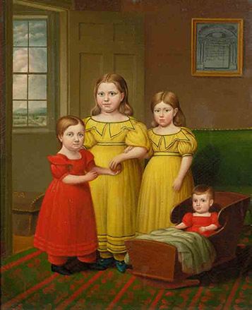 This brilliantly colored and perhaps most ambitious of all Peckham's portraits of children depicts the sons and daughters of John Thurston and Mersylvia Farwell of Fitchburg, Massachusetts. According to family accounts, it was painted the year Mary Jane (shown in her wicker carriage) died. John Farwell, owner of a flourishing scythe shop, was, like Peckham, a deacon in his local Congregational church, and the two men may have known each other in that capacity. Descendants did not record Peckham's name, knowing "of the painter only that he was an itinerant artist, by trade a 'wagon painter,' and that he lived in the family for several months while the portrait was in process." (Correspondence on file at the American Folk Art Museum, New York, and kindly provided by Stacey Hollander, Senior Curator.)