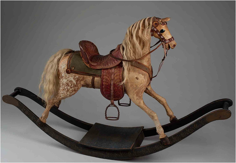The Marrett horse shares the same arch of the neck and elegant bow of the rockers that grace the Hobby Horse example. Both toys are also decorated with stenciling, one on the sides of the rockers, the other on the platform. The only odd note in the Marrett example is the addition of an elaborate red saddle identified in an inscription on the rocker as "New Mexican Saddle to Support the Back." It has been suggested that the rocking horse depicted by Peckham was created by a crafstman of English or German origin, working in this country, a supposition that may also be true of the artisan who created the Marrett horse.
