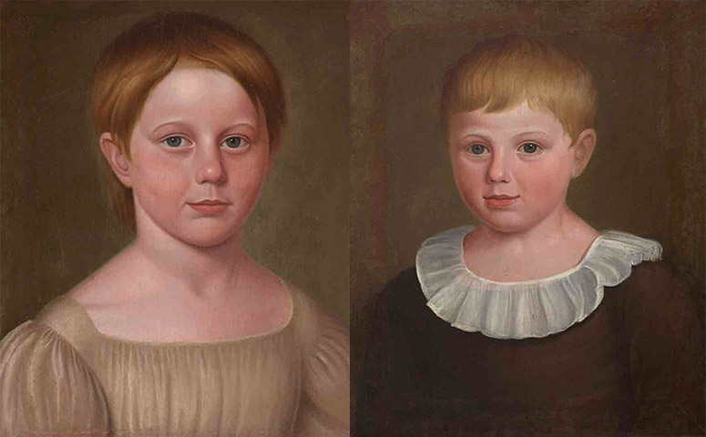 The portrait is believed to depict a brother and sister from Malden, Massachusetts: Charles Lynde Eaton, born March 1841, and Emily Lynde Eaton, born 1838. Given that Charles is shown not yet wearing trousers (attire that boys assumed around age five), the portrait probably dates from around 1844 or 1845. The pair of Argand lamps on the mantel and the astral lamp on the marble-grained table suggest a well-appointed home. Nearly all of Peckham's sitters were from Worcester County, but these children lived just north of Boston, in Middlesex County. If they were, indeed, painted by Peckham, his range of activity may be wider than we thought.