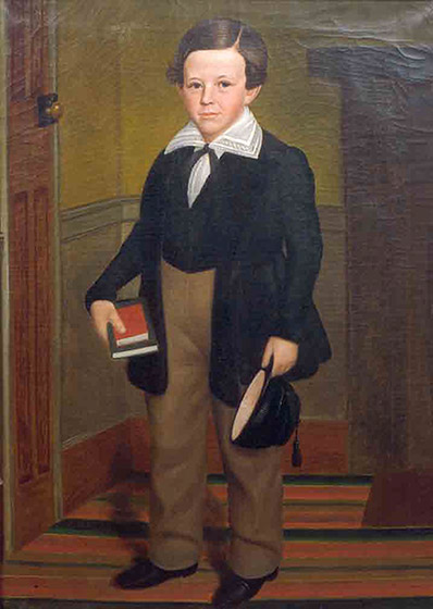 Captured as he is about to leave for school, young Webster (1834–1872) pauses at the door, cap in hand. With his slightly unruly hair and perhaps a faint smile, he stands in the corner before what appears to be a fireplace mantel, and upon a colorful yet fairly common Venetian carpet. While probably true to life, the size and shape of the boy's head may reflect the nineteenth-century interest in phrenology, a pseudoscientific belief that the shape of the skull could indicate intelligence and character. Here, Webster's broad forehead sculpted in light may have been intended to suggest the boy's astute and moral nature.