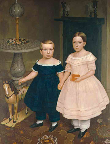 This portrait of an unidentified brother and sister was titled, upon its acquisition by Edgar William and Bernice Chrysler Garbisch, for its most prominent feature. The toy is perhaps more properly called a rocking horse (the term hobby horse often refers to the simple stick with horsehead), but the painting has retained the descriptive title. The Boston dealer from whom the Garbisches purchased the work recorded that it was found in an antique shop in Billerica, Massachusetts, but no clues as to artist or subject were attached. The typeface of the newspaper behind the horse's head may point to the Daily Evening Evening Transcript (later the Boston Evening Transcript). The style of the children's clothing suggests a date of about 1840. While the boy's eyes look sideways, the girl's gaze connects her strongly to the viewer. We are invited into this tidy domestic space by the open door that hints at a substantial home. The artist particularizes the setting by carefully delineating each element: the colorful ingrain carpet, the rainbow wallpaper, the state-of-the-art sinumbra lamp on the table covered with an embroidered cloth. This intense attention to furnishings is characteristic of Peckham's portraits of children in interiors.