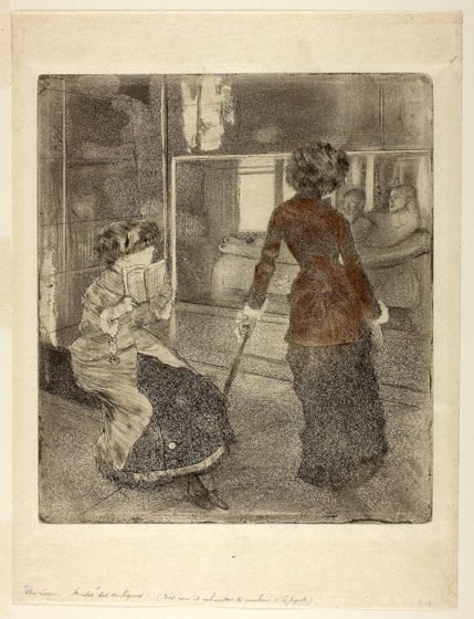 Edgar Degas, Mary Cassatt at the Louvre: The Etruscan Gallery, 1879–1880, softground etching, drypoint, aquatint, and etching retouched with red chalk, The Art Institute of Chicago, Albert Roullier Memorial Collection. Photography © The Art Institute of Chicago