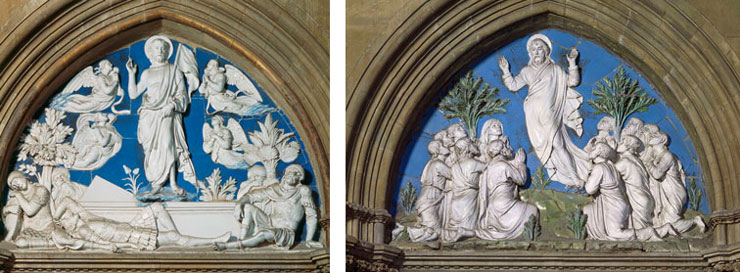 The first relief represents Christ’s resurrection on the third day after his death on the cross. Luca’s figures stand out strongly against the blue background by virtue of their modeling and white color, rendering them clear and readable even at a distance. The companion relief depicts the ascension of Christ to heaven 40 days after his resurrection. This composition is distinguished by a greater variety of color, especially in the greens that characterize the earthly realm from which Jesus ascends.