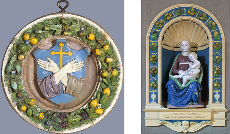 (Left) Attributed to Luca della Robbia the Younger, Coat of Arms of the Franciscan Order, c. 1525, North Carolina Museum of Art, Raleigh. Purchased with funds from the North Carolina State Art Society (Robert F. Phifer Bequest), G.55.25.2