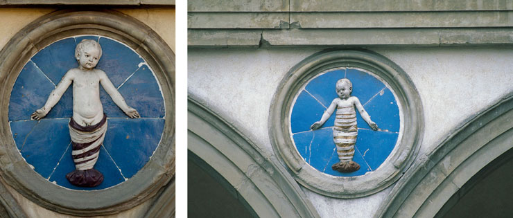 (Left) Andrea della Robbia, Roundel, installed 1487, Ospedale degli Innocenti, Florence, Photograph: Antonio Quattrone