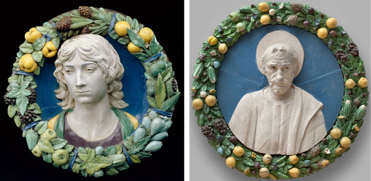 (Right) Andrea della Robbia, Roundel with Bust of a Saint, c. 1485–1490, The Nelson-Atkins Museum of Art, Kansas City, Missouri, Purchase: William Rockhill Nelson Trust. Photograph: Tiffany Matson