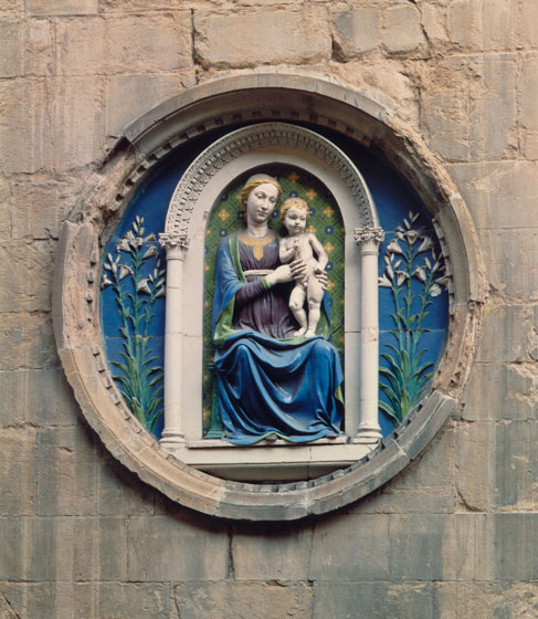 Luca’s roundel honoring the association of doctors, pharmacists, and spice merchants presents the guild’s protectors, the Madonna and Child, against a patterned background of green, yellow, and blue that may represent a luxurious fabric. Lilies, symbolic of both the Virgin and Florence, grow alongside the arched shrine that surrounds the figures.