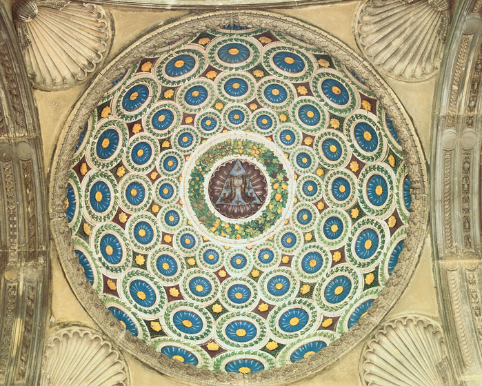 Luca also complemented the architect’s design for the cupola of the portico by covering its inner surface with a coffered pattern of molded tiles. At center appears the Pazzi coat of arms encircled by a fruit and flower garland. Around this, circles of blue and yellow rosettes, ringed with green, leafy wreaths, gradually expand in scale. This brilliantly colorful, reflective, and long-lasting decoration created an effect of opulence contained by rigorous geometry. Both the cupola and its decoration were completed well after Brunelleschi’s death in 1446.