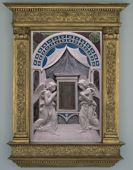 Other Della Robbia sculptures incorporating the forms of Renaissance architecture to serve the needs of churches include this tabernacle featured in the exhibition. In the glazed relief, angels venerate the bread for the sacrament of communion, once contained in a rectangular receptacle under a vault hung with curtains at the center.