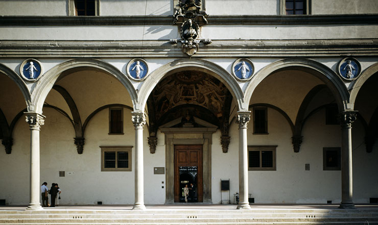 The Ospedale degli Innocenti (Hospital of the Innocents), dedicated to the care of orphaned and abandoned children, was designed by Filippo Brunelleschi in the 15th century with an elegant loggia, or covered arcade, overlooking Piazza Santissima Annunziata. Andrea della Robbia decorated the spandrels of the loggia with circular reliefs of swaddled infants on a blue ground.