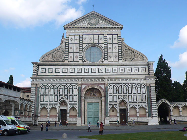 In the last decade of the 15th century, Giovanni della Robbia worked in the sacristy of the great Dominican church of Santa Maria Novella. The magnificent façade of patterned green and white stone was designed by the architect Leon Battista Alberti.