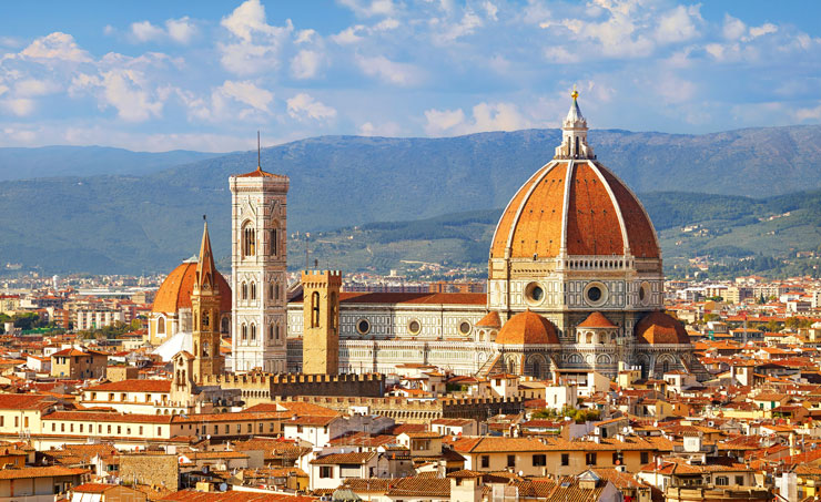 The cathedral of Santa Maria del Fiore is the quintessential monument of Renaissance Florence, its towering masonry dome faced with terracotta tiles rhyming with the warm brick and stone of the city and complementing the green and blue tones of the surrounding hills.