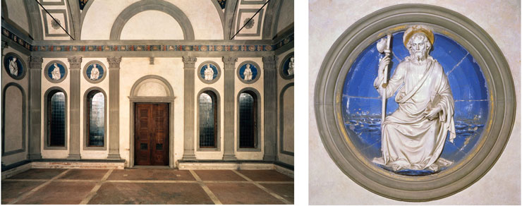 Luca sculpted circular medallions of the 12 Apostles, the early disciples of Jesus and preachers of the Gospel, including Andrew, James, and John, for the walls of the chapel interior. The roundels are glazed primarily in the signature Della Robbia colors of white against blue.