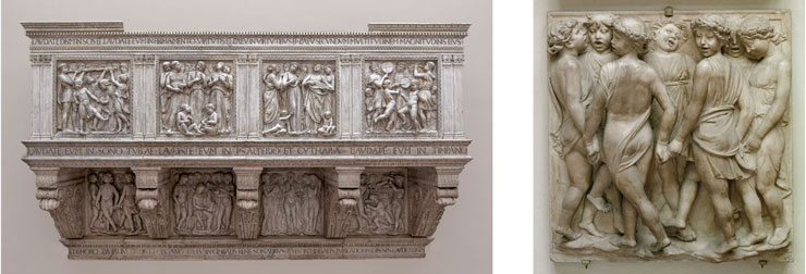 (Left) Luca della Robbia, Cantoria (organ loft), 1431–1438, marble, Museo dell'Opera del Duomo, Florence. Photograph courtesy Opera di S. Maria del Fiore