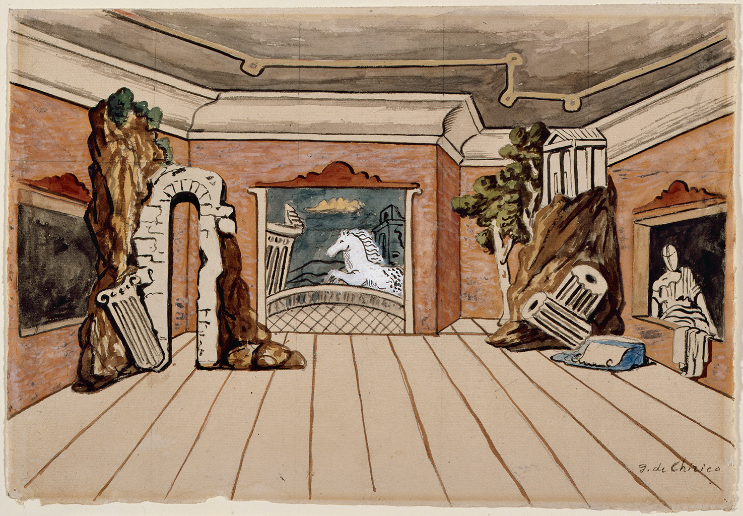 Giorgio de Chirico, Italian, 1888–1978, Set design (scene 2) for The Ball, 1929, graphite and tempera on paper, Wadsworth Atheneum Museum of Art, Hartford, CT, The Ella Gallup Sumner and Mary Catlin Sumner Collection Fund