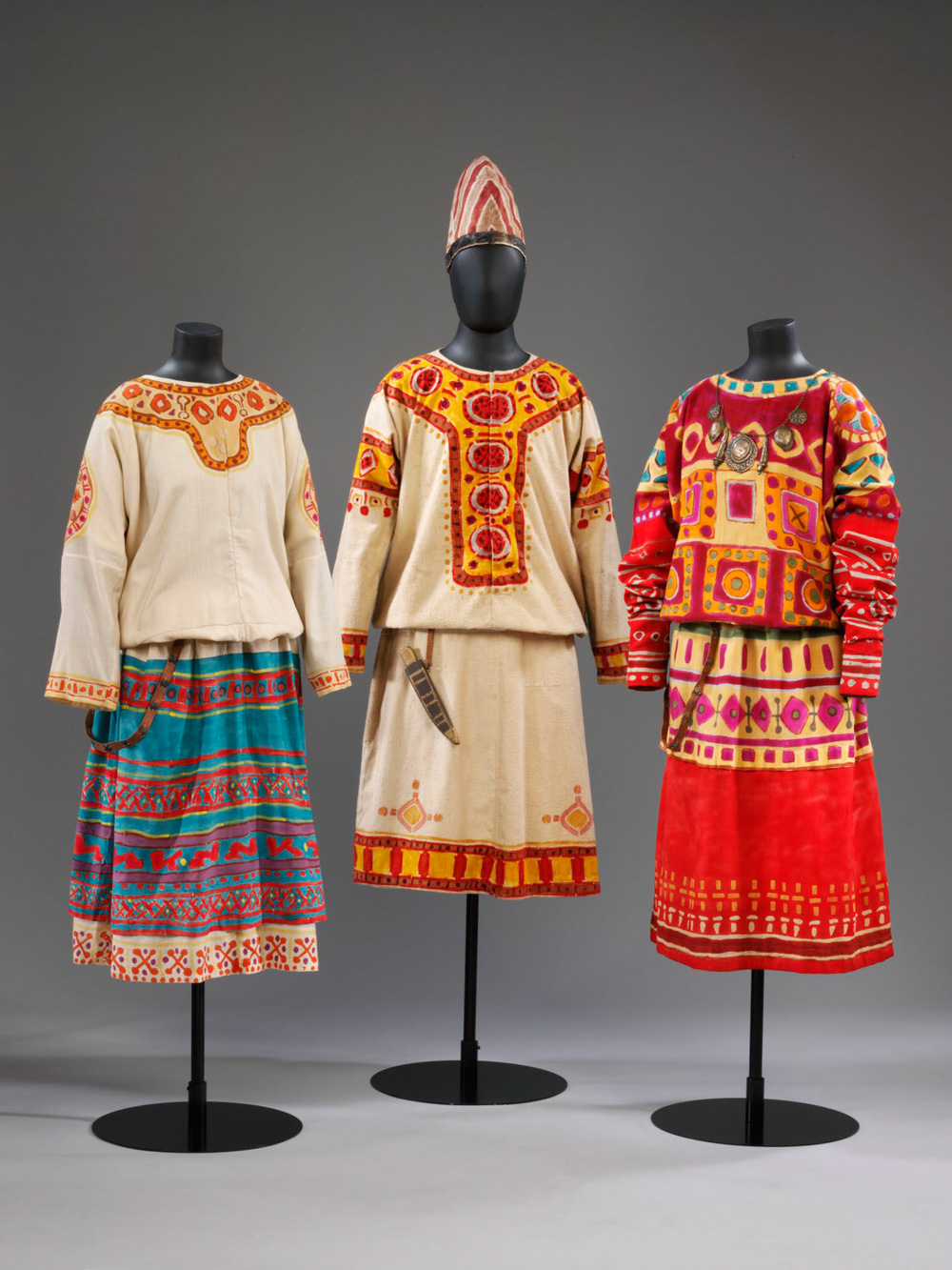 Nicholas Roerich, Russian, 1874–1947, Costumes for two Maidens and an Elder from The Rite of Spring, 1913, wool, leather, metal belts and necklace, napped cotton, wood, and fur, V&A, London © Victoria and Albert Museum, London