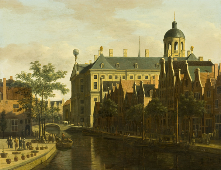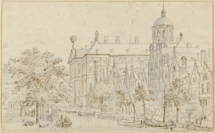 Berckheyde’s detailed, highly accurate drawing of the rear of Amsterdam’s town hall (the canal has since been filled in) served as inspiration for five paintings, including the one in the following slide.