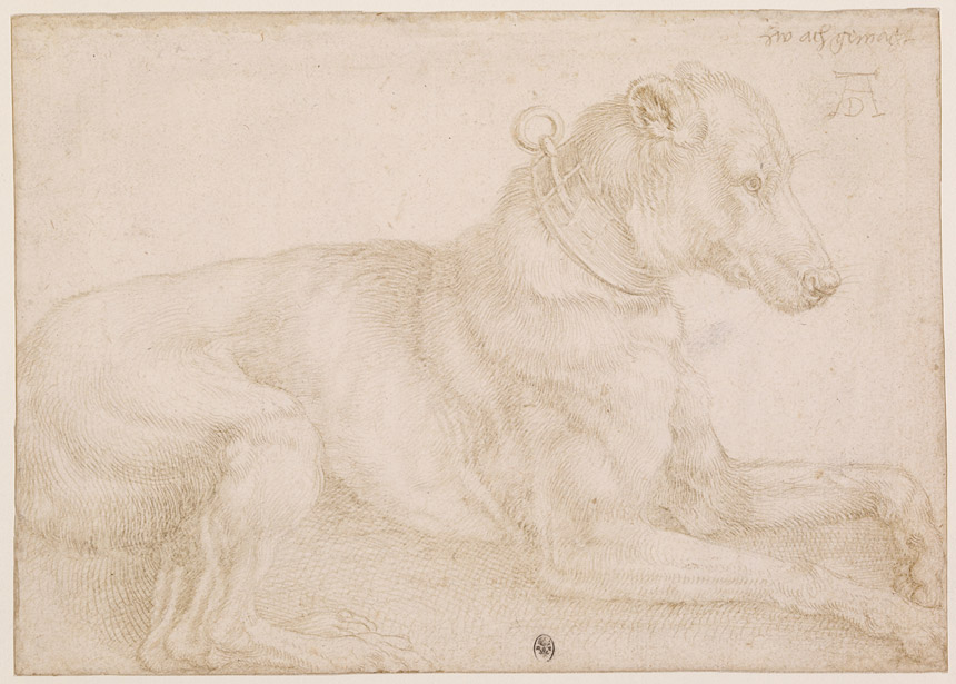 Albrecht Dürer (German, 1471 - 1528), A Dog Resting (recto); Studies of Two Women (verso), 1520, silverpoint over traces of carbon black on pale pink prepared paper (recto); silverpoint on pale pink prepared paper (verso), 5 1/16 × 7 1/16 (12.8 × 18), On loan from The British Museum, London © The Trustees of the British Museum, London, 1848,1125.3.